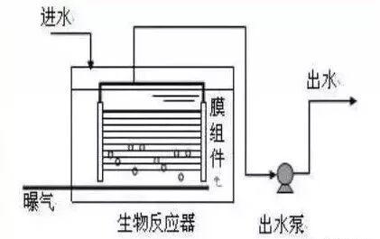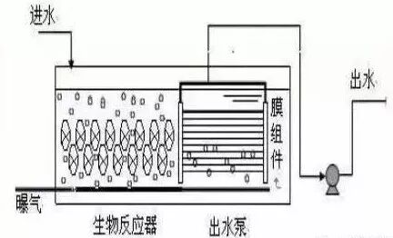 把膜组件置于生物反应器内部。进水进入膜--生物反应器,其中的大部分污染物被混合液中的活性污泥去除,再在外压作用下由膜过滤出水。