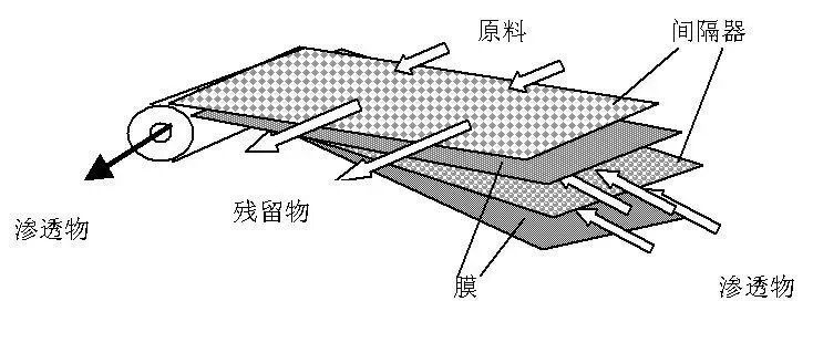 螺旋卷式简称卷式,主要部件为多孔支撑材料,两侧是膜,三边密封,开放边与一根多孔的中心产品水收集管密封连接,在膜袋外部的原水侧垫一层网眼型间隔材料,把膜袋-隔网依次迭合,绕中心集水管紧密地卷起来,形成一个膜卷,装进圆柱形压力容器内,就制成了一个螺旋卷式膜组件。