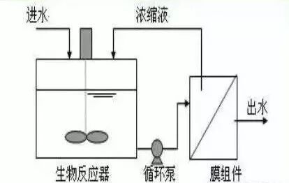 把膜组件和生物反应器分开设置。生物反应器中的混合液经循环泵增压后打至膜组件的过滤端,在压力作用下混合液中的液体透过膜,成为系统处理水;固形物、大分子物质等则被膜截留,随浓缩液回流到生物反应器内。
